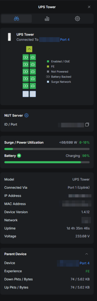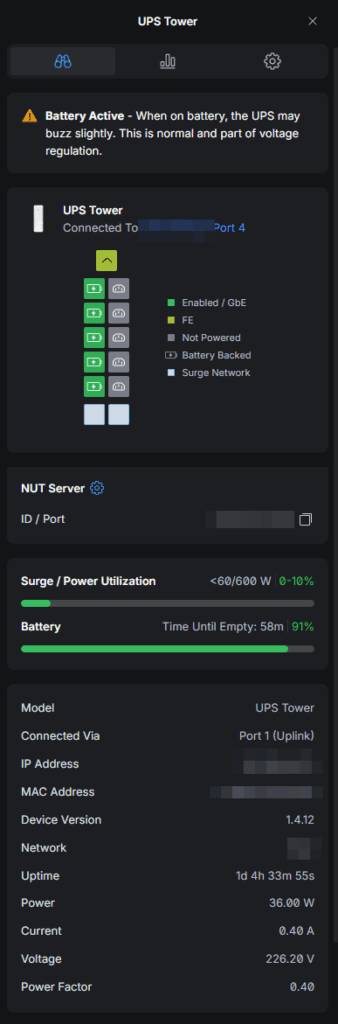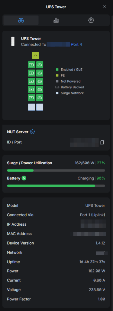 The UPS runs a built-in NUT server, exposing detailed metrics.